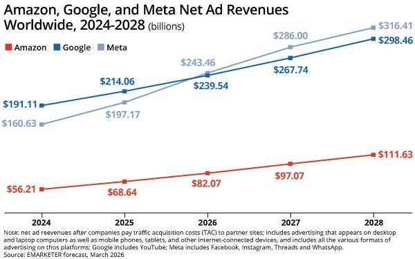 如果你最近还在把预算惯性压在搜索广告上,那可能已经慢了半拍。2026年的全球广告市场,正在出现一个过去很多人不太愿意相信的变化:坐了十多年头把交椅的谷歌,第一次在全球数字广告净收入上,被Meta反超。eMarketer最新预测显示,Meta 2026年全球数字广告净收入将达到2434.6亿美元,超过谷歌的2395.4亿美元;同时,Meta今年广告收入增速预计为24.1%,明显高于谷歌的11.9%。这不是简单的排名互换,而是流量分发逻辑、广告效率模型和商家获客路径同时改写的信号。